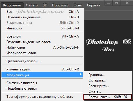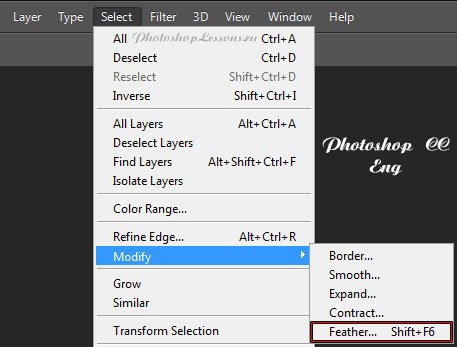| Перевод Select - Modify - Feather (Выделение - Модификация - Растушевка / Shift+F6)Перевод и месторасположение Select - Modify - Feather (Выделение - Модификация - Растушевка / Shift+F6) на примере Photoshop CC (Eng/Rus). На изображениях ниже вы можете наглядно увидеть месторасположение и перевод термина Select - Modify - Feather (Выделение - Модификация - Растушевка / Сочетание клавиш «Shift+F6») на примере Английской и Русской версии Photoshop CC (2014). ![]() ![]() |