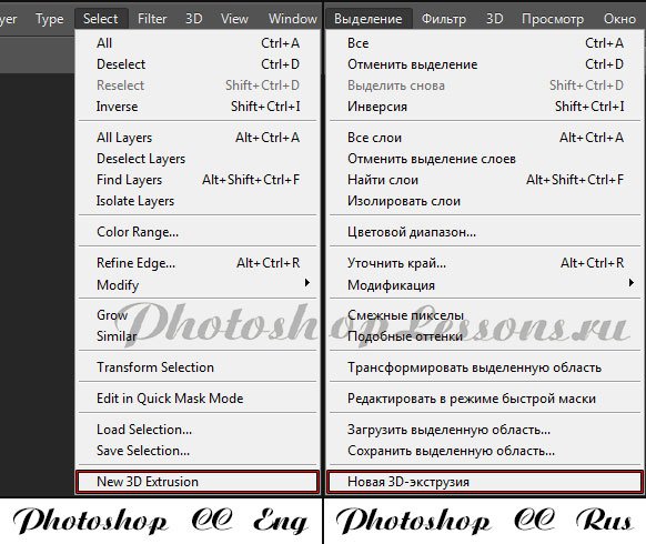 | Перевод Select - New 3D Extrusion (Выделение - Новая 3D-экструзия)Перевод и месторасположение Select - New 3D Extrusion (Выделение - Новая 3D-экструзия) на примере Photoshop CC (Eng/Rus). На изображении ниже вы можете наглядно увидеть месторасположение и перевод термина Select - New 3D Extrusion (Выделение - Новая 3D-экструзия) на примере Английской и Русской версии Photoshop CC (2014). ![]() |