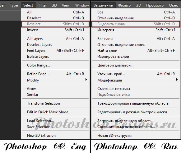 | Перевод Select - Reselect (Выделение - Выделить снова / Shift+Ctrl+D)Перевод и месторасположение Select - Reselect (Выделение - Выделить снова / Shift+Ctrl+D) на примере Photoshop CC (Eng/Rus). На изображении ниже вы можете наглядно увидеть месторасположение и перевод термина Select - Reselect (Выделение - Выделить снова / Сочетание клавиш «Shift+Ctrl+D») на примере Английской и Русской версии Photoshop CC (2014). ![]() |