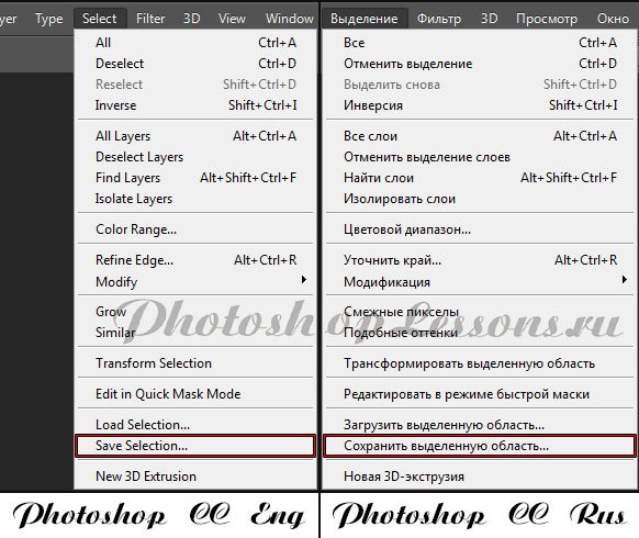 | Перевод Select - Save Selection (Выделение - Сохранить выделенную область)Перевод и месторасположение Select - Save Selection (Выделение - Сохранить выделенную область) на примере Photoshop CC (Eng/Rus). На изображении ниже вы можете наглядно увидеть месторасположение и перевод термина Select - Save Selection (Выделение - Сохранить выделенную область) на примере Английской и Русской версии Photoshop CC (2014). ![]() |