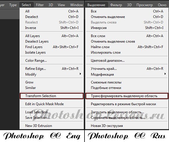 | Перевод Select - Transform Selection (Выделение - Трансформировать выделенную область)Перевод и месторасположение Select - Transform Selection (Выделение - Трансформировать выделенную область) на примере Photoshop CC (Eng/Rus). На изображении ниже вы можете наглядно увидеть месторасположение и перевод термина Select - Transform Selection (Выделение - Трансформировать выделенную область) на примере Английской и Русской версии Photoshop CC (2014). ![]() |