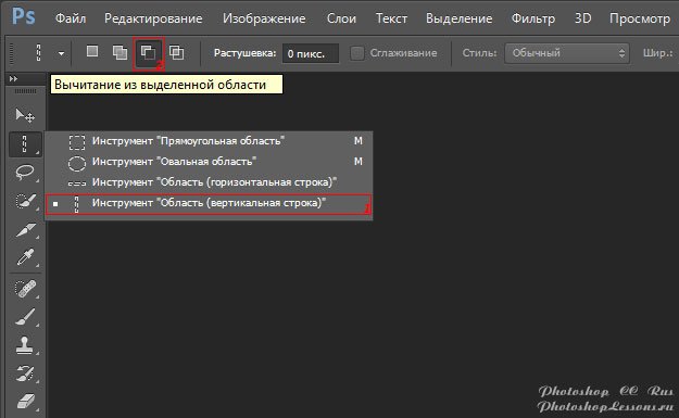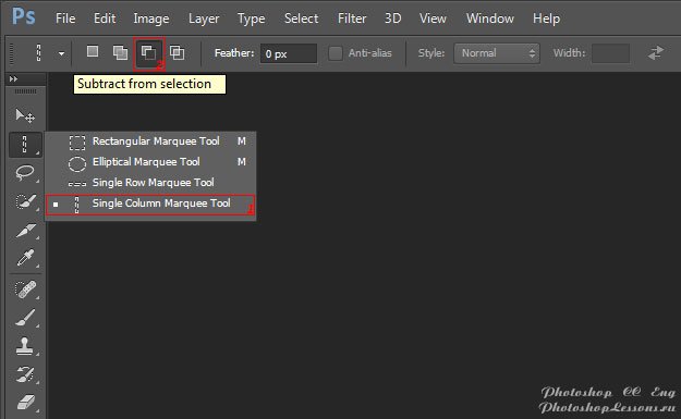 | Single Column Marquee Tool - Subtract from selection (Инструмент «Область (верт. строка)» - Вычитание из выделения)Перевод и месторасположение Single Column Marquee Tool - Subtract from selection (Инструмент «Область (вертикальная строка)» - Вычитание из выделенной области) на примере Photoshop CC (Eng/Rus). На изображениях ниже вы можете наглядно увидеть месторасположение и перевод Single Column Marquee Tool - Subtract from selection (Инструмент «Область (вертикальная строка)» - Вычитание из выделенной области) на примере Английской и Русской версии Photoshop CC (2014). ![]() ![]() |