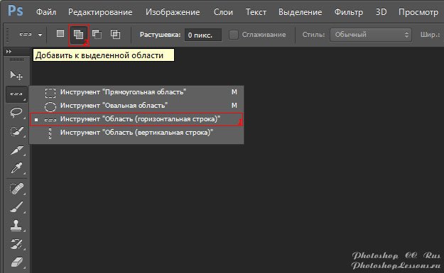 | Single Row Marquee Tool - Add to selection (Инструмент «Область (горизонтальная строка)» - Добавить к выделению)Перевод и месторасположение Single Row Marquee Tool - Add to selection (Инструмент «Область (горизонтальная строка)» - Добавить к выделению) на примере Photoshop CC (Eng/Rus). На изображениях ниже вы можете наглядно увидеть месторасположение и перевод Single Row Marquee Tool - Add to selection (Инструмент «Область (горизонтальная строка)» - Добавить к выделению) на примере Английской и Русской версии Photoshop CC (2014). ![]() ![]() |
