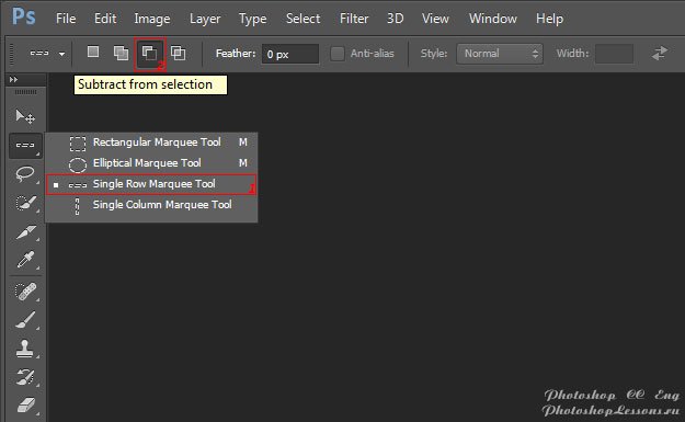 | Single Row Marquee Tool - Subtract from selection (Инструмент «Область (гориз. строка)» - Вычитание из выделения)Перевод и месторасположение Single Row Marquee Tool - Subtract from selection (Инструмент «Область (горизонтальная строка)» - Вычитание из выделения) на примере Photoshop CC (Eng/Rus). На изображениях ниже вы можете наглядно увидеть месторасположение и перевод Single Row Marquee Tool - Subtract from selection (Инструмент «Область (горизонтальная строка)» - Вычитание из выделенной области) на примере Английской и Русской версии Photoshop CC (2014). ![]() ![]() |