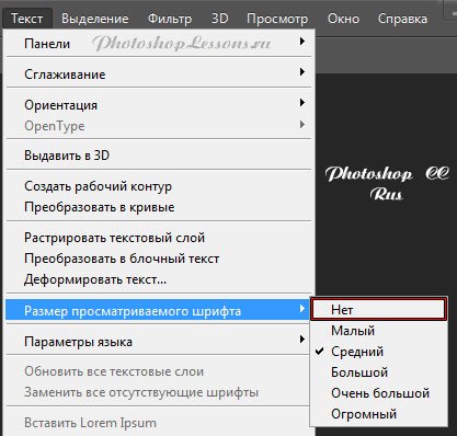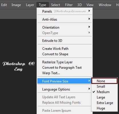 | Перевод Type - Font Preview Size - None (Текст - Размер просматриваемого шрифта - Нет)Перевод и месторасположение Type - Font Preview Size - None (Текст - Размер просматриваемого шрифта - Нет) на примере Photoshop CC (Eng/Rus). На изображениях ниже вы можете наглядно увидеть месторасположение и перевод термина Type - Font Preview Size - None (Текст - Размер просматриваемого шрифта - Нет) на примере Английской и Русской версии Photoshop CC (2014). ![]() ![]() |