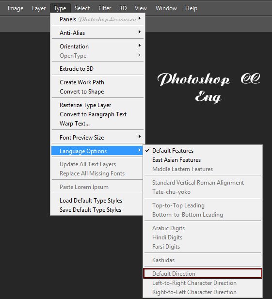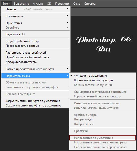 | Перевод Type - Language Options - Default Direction (Текст - Параметры языка - Направление по умолчанию)Перевод и месторасположение Type - Language Options - Default Direction (Текст - Параметры языка - Направление по умолчанию) на примере Photoshop CC (Eng/Rus). На изображениях ниже вы можете наглядно увидеть месторасположение и перевод термина Type - Language Options - Default Direction (Текст - Параметры языка - Направление по умолчанию) на примере Английской и Русской версии Photoshop CC (2014). ![]() ![]() |