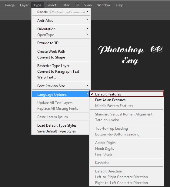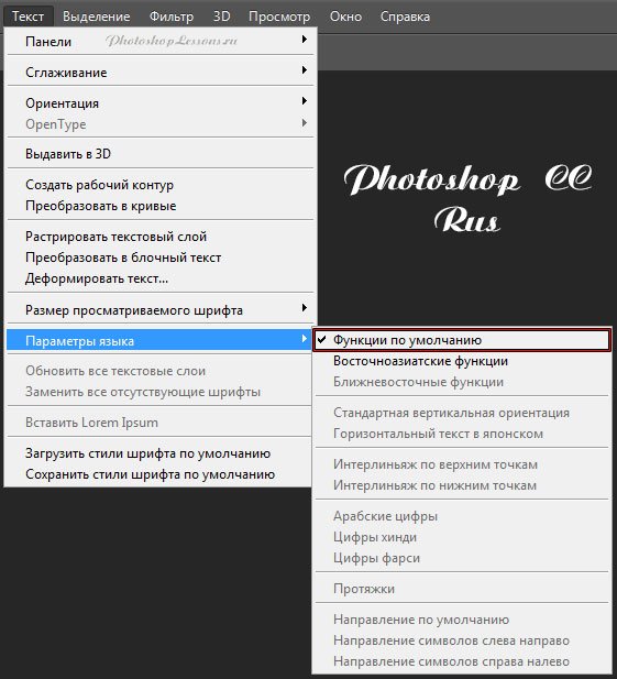 | Перевод Type - Language Options - Default Features (Текст - Параметры языка - Функции по умолчанию)Перевод и месторасположение Type - Language Options - Default Features (Текст - Параметры языка - Функции по умолчанию) на примере Photoshop CC (Eng/Rus). На изображениях ниже вы можете наглядно увидеть месторасположение и перевод термина Type - Language Options - Default Features (Текст - Параметры языка - Функции по умолчанию) на примере Английской и Русской версии Photoshop CC (2014). ![]() ![]() |