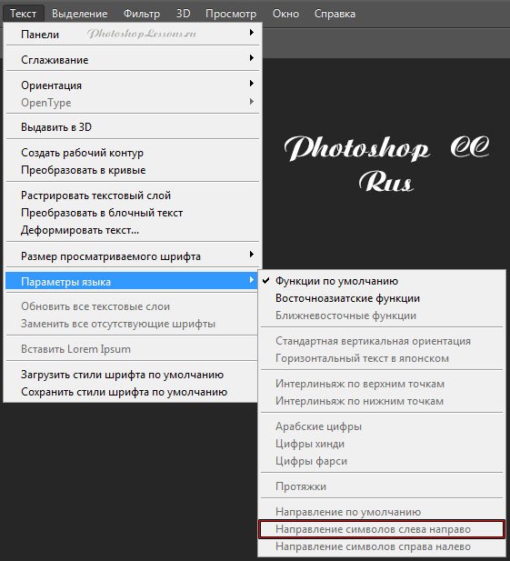 | Type - Language Options - Left-to-Right Character Direction (Текст- Параметры языка- Напр. символов слева направо)Перевод и месторасположение Type - Language Options - Left-to-Right Character Direction (Текст - Параметры языка - Направление символов слева направо) на примере Photoshop CC (Eng/Rus). На изображениях ниже вы можете наглядно увидеть месторасположение и перевод термина Type - Language Options - Left-to-Right Character Direction (Текст - Параметры языка - Направление символов слева направо) на примере Английской и Русской версии Photoshop CC (2014). ![]() ![]() |