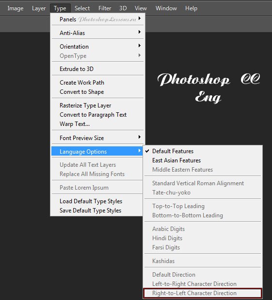 | Type - Language Options - Right-to-Left Character Direction (Текст- Параметры языка- Напр. символов справа налево)Перевод и месторасположение Type - Language Options - Right-to-Left Character Direction (Текст - Параметры языка - Направление символов справа налево) на примере Photoshop CC (Eng/Rus). На изображениях ниже вы можете наглядно увидеть месторасположение и перевод термина Type - Language Options - Right-to-Left Character Direction (Текст - Параметры языка - Направление символов справа налево) на примере Английской и Русской версии Photoshop CC (2014). ![]() ![]() |