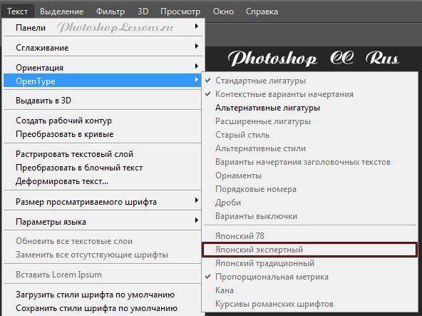 | Перевод Type - OpenType - Japanese Expert (Текст - OpenType - Японский экспертный)Перевод и месторасположение Type - OpenType - Japanese Expert (Текст - OpenType - Японский экспертный) на примере Photoshop CC (Eng/Rus). На изображениях ниже вы можете наглядно увидеть месторасположение и перевод термина Type - OpenType - Japanese Expert (Текст - OpenType - Японский экспертный) на примере Английской и Русской версии Photoshop CC (2014). ![]() ![]() |