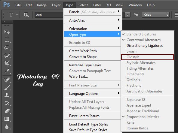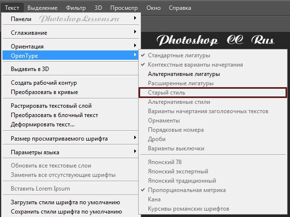 | Перевод Type - OpenType - Oldstyle (Текст - OpenType - Старый стиль)Перевод и месторасположение Type - OpenType - Oldstyle (Текст - OpenType - Старый стиль) на примере Photoshop CC (Eng/Rus). На изображениях ниже вы можете наглядно увидеть месторасположение и перевод термина Type - OpenType - Oldstyle (Текст - OpenType - Старый стиль) на примере Английской и Русской версии Photoshop CC (2014). ![]() ![]() |