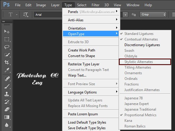 | Перевод Type - OpenType - Stylistic Alternates (Текст - OpenType - Альтернативные стили)Перевод и месторасположение Type - OpenType - Stylistic Alternates (Текст - OpenType - Альтернативные стили) на примере Photoshop CC (Eng/Rus). На изображениях ниже вы можете наглядно увидеть месторасположение и перевод термина Type - OpenType - Stylistic Alternates (Текст - OpenType - Альтернативные стили) на примере Английской и Русской версии Photoshop CC (2014). ![]() ![]() |