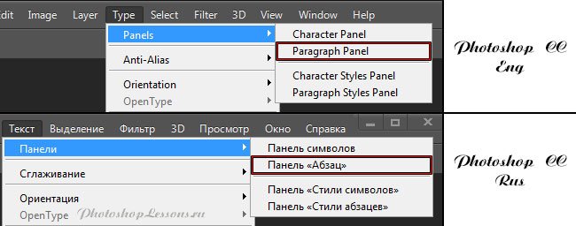 | Перевод Type - Panels - Paragraph Panel (Текст - Панели - Панель «Абзац»)Перевод и месторасположение Type - Panels - Paragraph Panel (Текст - Панели - Панель «Абзац») на примере Photoshop CC (Eng/Rus). На изображении ниже вы можете наглядно увидеть месторасположение и перевод термина Type - Panels - Paragraph Panel (Текст - Панели - Панель «Абзац») на примере Английской и Русской версии Photoshop CC (2014). ![]() |
