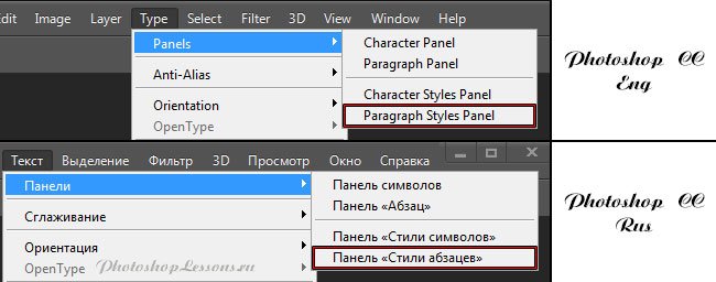 | Перевод Type - Panels - Paragraph Styles Panel (Текст - Панели - Панель «Стили абзацев»)Перевод и месторасположение Type - Panels - Paragraph Styles Panel (Текст - Панели - Панель «Стили абзацев») на примере Photoshop CC (Eng/Rus). На изображении ниже вы можете наглядно увидеть месторасположение и перевод термина Type - Panels - Paragraph Styles Panel (Текст - Панели - Панель «Стили абзацев») на примере Английской и Русской версии Photoshop CC (2014). ![]() |