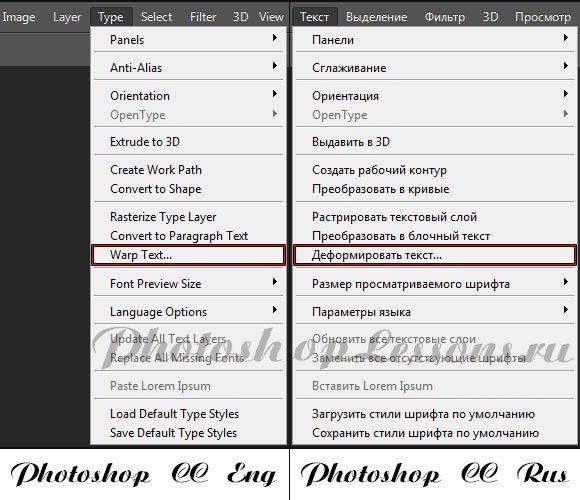 | Перевод Type - Warp Text (Текст - Деформировать текст)Перевод и месторасположение Type - Warp Text (Текст - Деформировать текст) на примере Photoshop CC (Eng/Rus). На изображении ниже вы можете наглядно увидеть месторасположение и перевод термина Type - Warp Text (Текст - Деформировать текст) на примере Английской и Русской версии Photoshop CC (2014). ![]() |