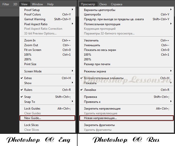 | Перевод View - New Guide (Просмотр - Новая направляющая)Перевод и месторасположение View - New Guide (Просмотр - Новая направляющая) на примере Photoshop CC (Eng/Rus). На изображении ниже вы можете наглядно увидеть месторасположение и перевод термина View - New Guide (Просмотр - Новая направляющая) на примере Английской и Русской версии Photoshop CC (2014). ![]() |