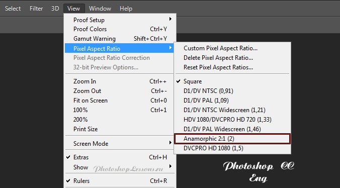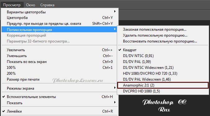 | View - Pixel Aspect Ratio - Anamorphic 2:1Месторасположение View - Pixel Aspect Ratio - Anamorphic 2:1 на примере Photoshop CC (Eng/Rus). На изображениях ниже вы можете наглядно увидеть месторасположение View - Pixel Aspect Ratio - Anamorphic 2:1 на примере Английской и Русской версии Photoshop CC (2014). |