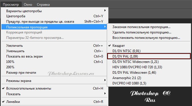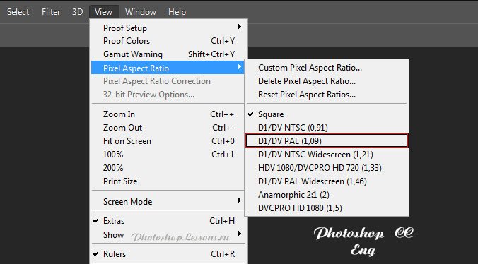 | View - Pixel Aspect Ratio - D1/DV Pal (1.09)Месторасположение View - Pixel Aspect Ratio - D1/DV Pal (1.09) на примере Photoshop CC (Eng/Rus). На изображении ниже вы можете наглядно увидеть месторасположение View - Pixel Aspect Ratio - D1/DV Pal (1.09) на примере Английской и Русской версии Photoshop CC (2014). |