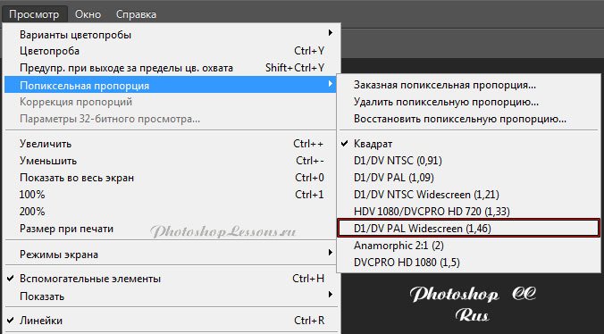 | View - Pixel Aspect Ratio - D1/DV PAL Widescreen (1,46)Месторасположение View - Pixel Aspect Ratio - D1/DV PAL Widescreen (1,46) на примере Photoshop CC (Eng/Rus). На изображениях ниже вы можете наглядно увидеть месторасположение и перевод термина View - Pixel Aspect Ratio - D1/DV PAL Widescreen (1,46) на примере Английской и Русской версии Photoshop CC (2014). |
