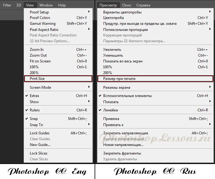 | Перевод View - Print Size (Просмотр - Размер при печати)Перевод и месторасположение View - Print Size (Просмотр - Размер при печати) на примере Photoshop CC (Eng/Rus). На изображении ниже вы можете наглядно увидеть месторасположение и перевод термина View - Print Size (Просмотр - Размер при печати) на примере Английской и Русской версии Photoshop CC (2014). ![]() |
