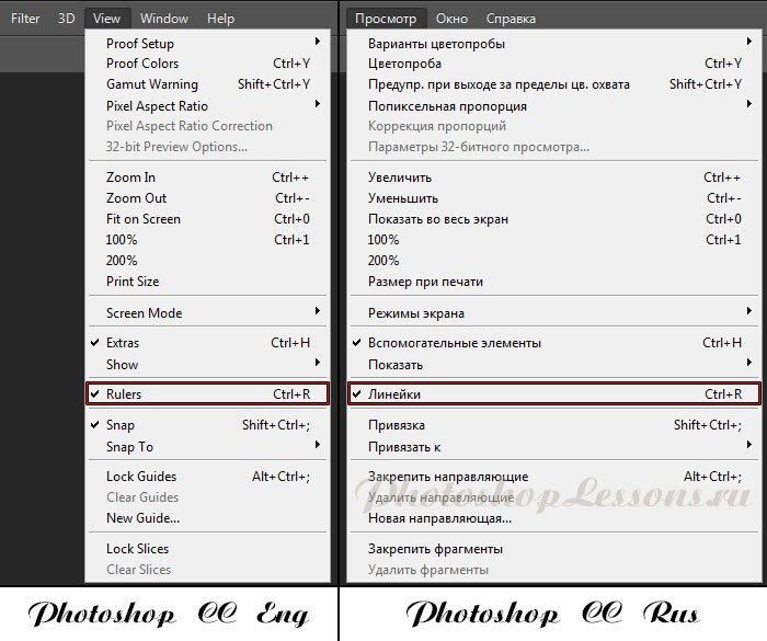 | Перевод View - Rulers (Просмотр - Линейки / Ctrl+R)Перевод и месторасположение View - Rulers (Просмотр - Линейки / Ctrl+R) на примере Photoshop CC (Eng/Rus). На изображении ниже вы можете наглядно увидеть месторасположение и перевод термина View - Rulers (Просмотр - Линейки / Сочетание клавиш «Ctrl+R») на примере Английской и Русской версии Photoshop CC (2014). ![]() |
