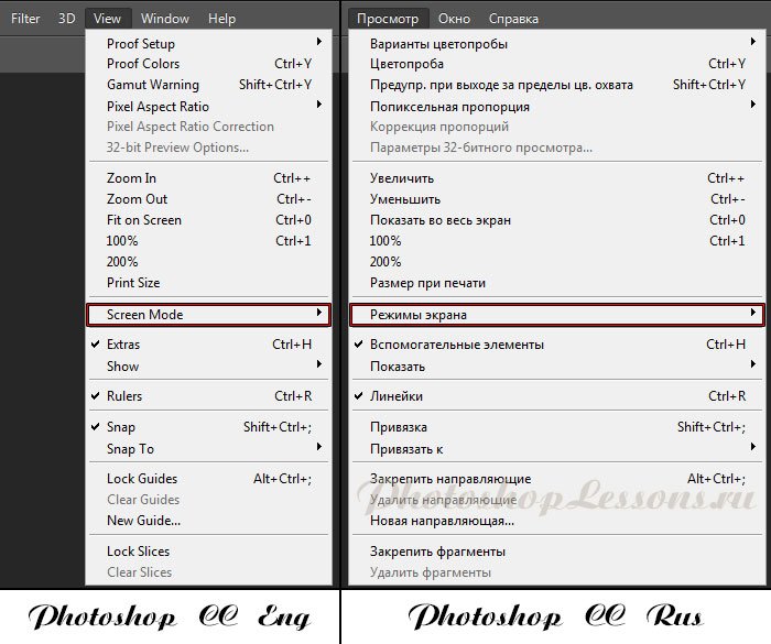 | Перевод View - Screen Mode (Просмотр - Режимы экрана)Перевод и месторасположение View - Screen Mode (Просмотр - Режимы экрана) на примере Photoshop CC (Eng/Rus). На изображении ниже вы можете наглядно увидеть месторасположение и перевод термина View - Screen Mode (Просмотр - Режимы экрана) на примере Английской и Русской версии Photoshop CC (2014). ![]() |