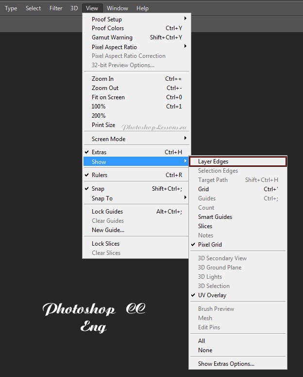 | Перевод View - Show - Layer Edges (Просмотр - Показать - Границу слоя)Перевод и месторасположение View - Show - Layer Edges (Просмотр - Показать - Границу слоя) на примере Photoshop CC (Eng/Rus). На изображениях ниже вы можете наглядно увидеть месторасположение и перевод термина View - Show - Layer Edges (Просмотр - Показать - Границу слоя) на примере Английской и Русской версии Photoshop CC (2014). ![]() ![]() |