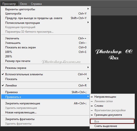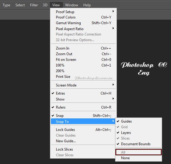 | Перевод View - Snap To - All (Просмотр - Привязать к - Все)Перевод и месторасположение View - Snap To - All (Просмотр - Привязать к - Все) на примере Photoshop CC (Eng/Rus). На изображениях ниже вы можете наглядно увидеть месторасположение и перевод термина View - Snap To - All (Просмотр - Привязать к - Все) на примере Английской и Русской версии Photoshop CC (2014). ![]() ![]() |