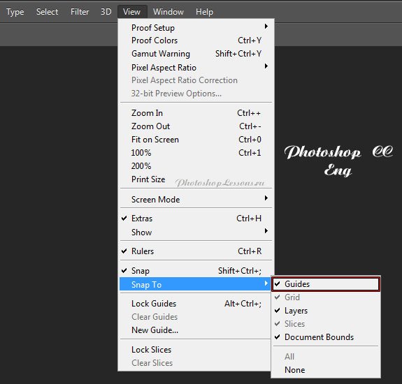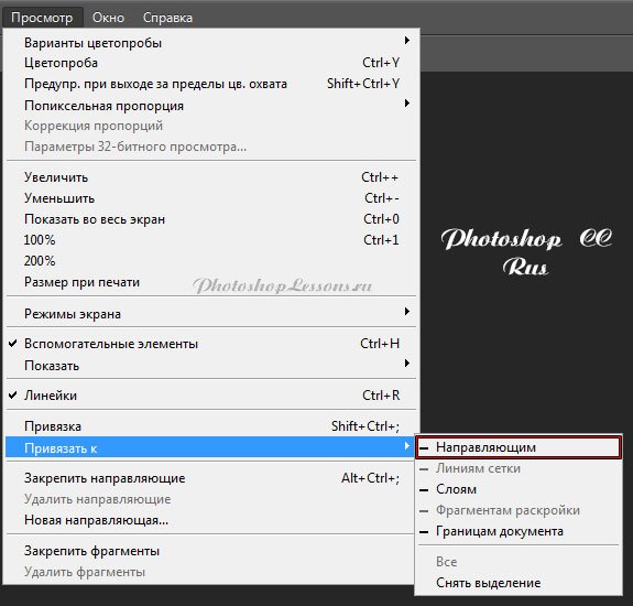 | Перевод View - Snap To - Guides (Просмотр - Привязать к - Направляющим)Перевод и месторасположение View - Snap To - Guides (Просмотр - Привязать к - Направляющим) на примере Photoshop CC (Eng/Rus). На изображениях ниже вы можете наглядно увидеть месторасположение и перевод термина View - Snap To - Guides (Просмотр - Привязать к - Направляющим) на примере Английской и Русской версии Photoshop CC (2014). ![]() ![]() |