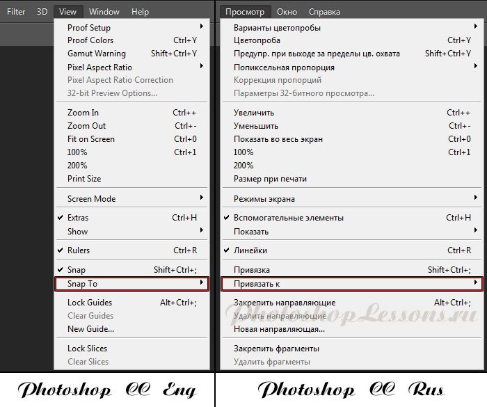 | Перевод View - Snap To (Просмотр - Привязать к)Перевод и месторасположение View - Snap To (Просмотр - Привязать к) на примере Photoshop CC (Eng/Rus). На изображении ниже вы можете наглядно увидеть месторасположение и перевод термина View - Snap To (Просмотр - Привязать к) на примере Английской и Русской версии Photoshop CC (2014). ![]() |