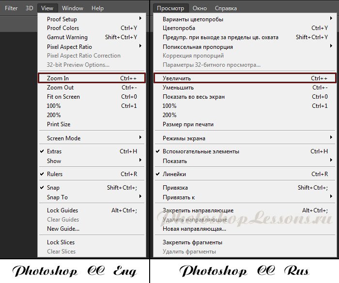 | Перевод View - Zoom In (Просмотр - Увеличить / Ctrl++)Перевод и месторасположение View - Zoom In (Просмотр - Увеличить / Ctrl++) на примере Photoshop CC (Eng/Rus). На изображении ниже вы можете наглядно увидеть месторасположение и перевод термина View - Zoom In (Просмотр - Увеличить / Сочетание клавиш «Ctrl++») на примере Английской и Русской версии Photoshop CC (2014). ![]() |