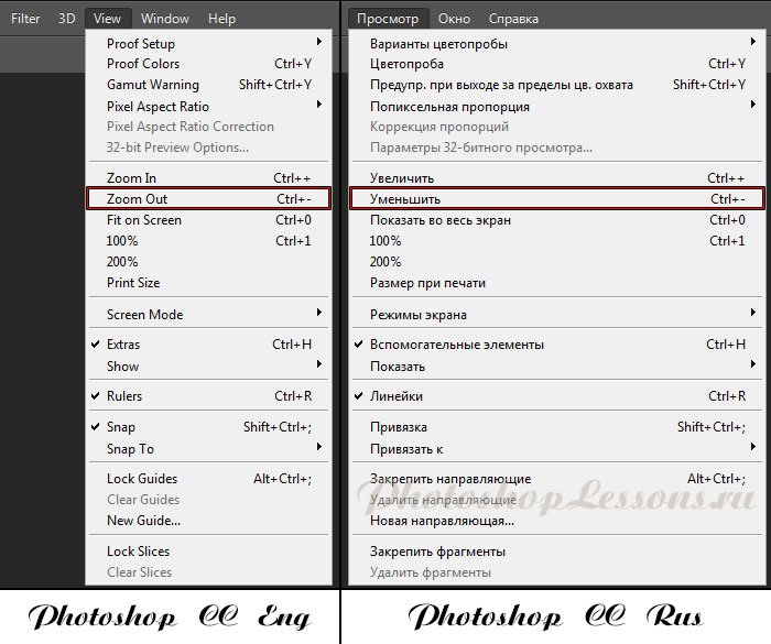 | Перевод View - Zoom Out (Просмотр - Уменьшить / Ctrl+-)Перевод и месторасположение View - Zoom Out (Просмотр - Уменьшить / Ctrl+-) на примере Photoshop CC (Eng/Rus). На изображении ниже вы можете наглядно увидеть месторасположение и перевод термина View - Zoom Out (Просмотр - Уменьшить / Сочетание клавиш «Ctrl+-») на примере Английской и Русской версии Photoshop CC (2014). ![]() |