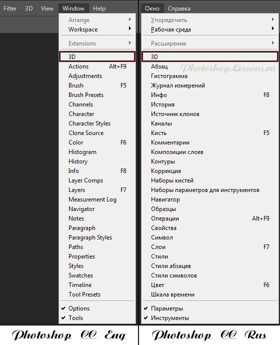 | Перевод Window - 3D (Окно - 3D)Перевод и месторасположение Window - 3D (Окно - 3D) на примере Photoshop CC (Eng/Rus). На изображении ниже вы можете наглядно увидеть месторасположение и перевод термина Window - 3D (Окно - 3D) на примере Английской и Русской версии Photoshop CC (2014). ![]() |