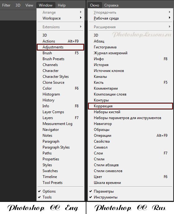 | Перевод Window - Adjustments (Окно - Коррекция)Перевод и месторасположение Window - Adjustments (Окно - Коррекция) на примере Photoshop CC (Eng/Rus). На изображении ниже вы можете наглядно увидеть месторасположение и перевод термина Window - Adjustments (Окно - Коррекция) на примере Английской и Русской версии Photoshop CC (2014). ![]() |