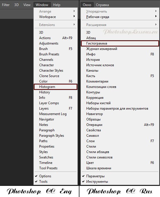 | Перевод Window - Histogram (Окно - Гистограмма)Перевод и месторасположение Window - Histogram (Окно - Гистограмма) на примере Photoshop CC (Eng/Rus). На изображении ниже вы можете наглядно увидеть месторасположение и перевод термина Window - Histogram (Окно - Гистограмма) на примере Английской и Русской версии Photoshop CC (2014). ![]() |