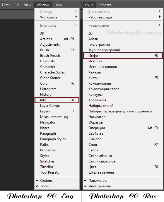 | Перевод Window - Info (Окно - Инфо / F8)Перевод и месторасположение Window - Info (Окно - Инфо / F8) на примере Photoshop CC (Eng/Rus). На изображении ниже вы можете наглядно увидеть месторасположение и перевод термина Window - Info (Окно - Инфо / Клавиша «F8») на примере Английской и Русской версии Photoshop CC (2014). ![]() |