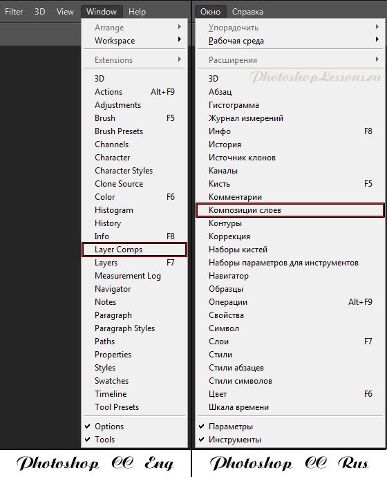 | Перевод Window - Layer Comps (Окно - Композиции слоев)Перевод и месторасположение Window - Layer Comps (Окно - Композиции слоев) на примере Photoshop CC (Eng/Rus). На изображении ниже вы можете наглядно увидеть месторасположение и перевод термина Window - Layer Comps (Окно - Композиции слоев) на примере Английской и Русской версии Photoshop CC (2014). ![]() |