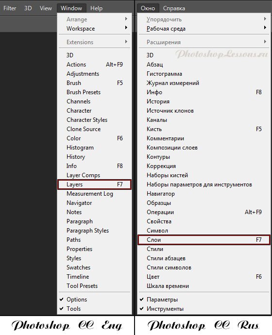 | Перевод Window - Layers (Окно - Слои / F7)Перевод и месторасположение Window - Layers (Окно - Слои / F7) на примере Photoshop CC (Eng/Rus). На изображении ниже вы можете наглядно увидеть месторасположение и перевод термина Window - Layers (Окно - Слои / Клавиша «F7») на примере Английской и Русской версии Photoshop CC (2014). ![]() |