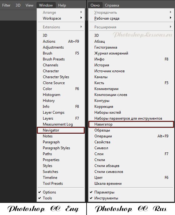 | Перевод Window - Navigator (Окно - Навигатор)Перевод и месторасположение Window - Navigator (Окно - Навигатор) на примере Photoshop CC (Eng/Rus). Ссылка на урок по панели навигации в Фотошопе. На изображении ниже вы можете наглядно увидеть месторасположение и перевод термина Window - Navigator (Окно - Навигатор) на примере Английской и Русской версии Photoshop CC. ![]() |