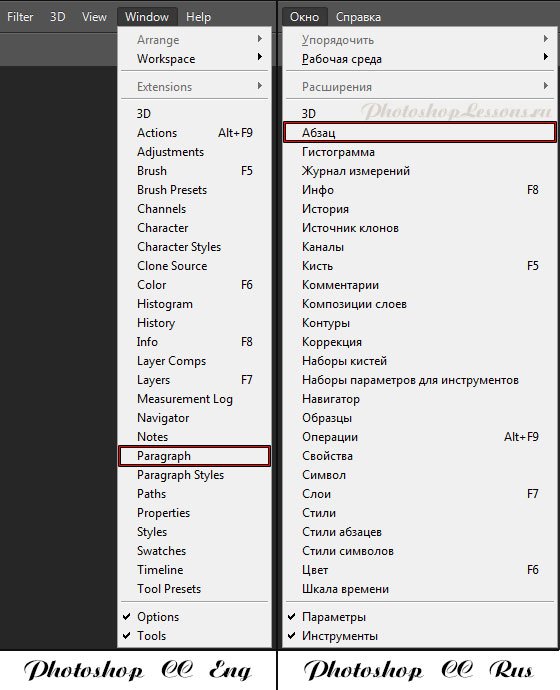 | Перевод Window - Paragraph (Окно - Абзац)Перевод и месторасположение Window - Paragraph (Окно - Абзац) на примере Photoshop CC (Eng/Rus). На изображении ниже вы можете наглядно увидеть месторасположение и перевод термина Window - Paragraph (Окно - Абзац) на примере Английской и Русской версии Photoshop CC (2014). ![]() |