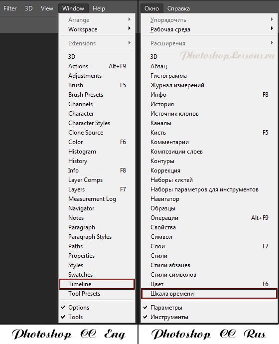 | Перевод Window - Timeline (Окно - Шкала времени)Перевод и месторасположение Window - Timeline (Окно - Шкала времени) на примере Photoshop CC (Eng/Rus). На изображении ниже вы можете наглядно увидеть месторасположение и перевод термина Window - Timeline (Окно - Шкала времени) на примере Английской и Русской версии Photoshop CC (2014). ![]() |