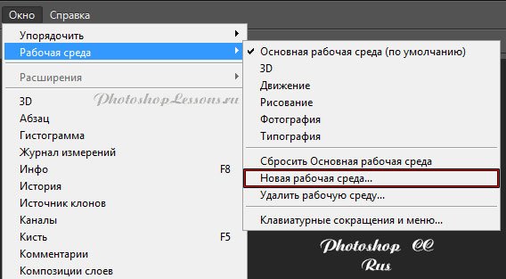 | Перевод Window - Workspace - New Workspace (Окно - Рабочая среда - Новая рабочая среда)Перевод и месторасположение Window - Workspace - New Workspace (Окно - Рабочая среда - Новая рабочая среда) на примере Photoshop CC (Eng/Rus). На изображениях ниже вы можете наглядно увидеть месторасположение и перевод термина Window - Workspace - New Workspace (Окно - Рабочая среда - Новая рабочая среда) на примере Английской и Русской версии Photoshop CC (2014). ![]() ![]() |