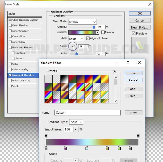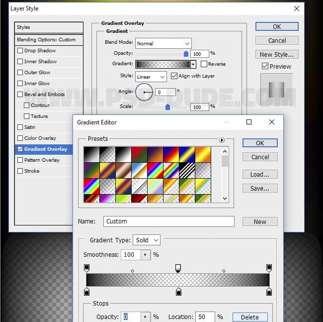 Фотошоп Online | Абстрактные световые спирали в ФотошопВ этом уроке рассмотрим пример создания абстрактных световых спиралей и кругов в программе фотошоп. В работе будем использовать градиенты и фильтры искажения, такие как фильтр Скручивание (Twirl), а также фильтр Зигзаг (ZigZag). С помощью этого метода можно создать огромное число световых эффектов, которые помогут вам в создании световых потоков в программе Photoshop.Мы создадим абстрактные спирали и круги с нуля. Вы сможете добавить красивые градиенты со всеми цветами радуги, чтобы с лёгкостью создать различные световые эффекты.Итак, давайте начнем!Итоговый результат:![]() Шаг 1Откройте программу Photoshop. Создайте новый PSD документ, установите размеры на своё усмотрение. Очень важно, чтобы ширина и высота рабочего документа были одного размера. Поэтому, ваш рабочий холст должен быть квадратным.![]() Шаг 2Создайте новый слой. Назовите этот слой Задний фон (Background). Залейте этот слой чёрным цветом.![]() Шаг 3Создайте ещё один новый слой. Назовите этот слой Абстрактные Световые Спирали (Abstract Light Swirl). Щёлкните правой кнопкой по данному слою и в появившемся меню, выберите опцию Преобразовать в смарт-объект (Convert to smart object).![]() Шаг 4Дважды щёлкните по миниатюре слоя со смарт-объектом Абстрактные Световые Спирали (Abstract Light Swirl), чтобы открыть его. Внутри создайте новый слой, назовите этот слой Градиент 1 (Gradient 1). Залейте этот слой любым цветом на своё усмотрение, а затем уменьшите значение Заливки (Fill) до 0%. Также, добавьте слой-маску к данному слою.![]() Шаг 5Продублируйте этот слой два раза (Ctrl+J), назовите дубликаты слоёв Градиент 2 (Gradient 2) и Градиент 3 (Gradient 3).![]() Шаг 6Для всех трёх слоёв, мы применим стиль слоя Наложение градиента (Gradient Overlay), а также добавим градиенты на слой-маски. Давайте начнём со слоя Градиент 1 (Gradient 1). Вначале уменьшите масштаб изображения примерно до 75%. Нажмите клавиши (CTRL+T) (для активации трансформации).![]() Шаг 7. Создадим затенение на слой-маскахЩёлкните по слой-маске, а затем выберите инструмент Градиент (Gradient Tool). Примените чёрно-белый градиент на маске слоя для коррекции маски, как показано на скрине ниже. Тип градиента Линейный (linear) (переход от одного цветового оттенка к другому по прямой линии). Удерживайте клавишу ‘SHIFT’ при создании градиента, это поможет создать идеальный горизонтальный или в нашем случае идеальный вертикальный градиент.![]() Шаг 8Перейдите на слой Градиент 2 (Gradient 2), а затем повторите предыдущий шаг для коррекции маски слоя. На скрине ниже, вы можете увидеть, что мы немного уменьшили размер градиента.![]() Маска слоя Градиент 3 (Gradient 3) остаётся белой, этот слой будет полностью виден. Шаг 9. Добавим стили градиентаТеперь давайте добавим стиль слоя Наложение градиента (Gradient Overlay) ко всем трём слоям. Вначале добавьте стиль слоя Наложение градиента (Gradient Overlay) к слою Градиент 1 (Gradient 1). Установите следующие цвета градиента: #f9e600, #6f156c, #fd7c00 и #f1c578.![]() Шаг 10Далее, добавьте стиль слоя Наложение градиента (Gradient Overlay) к слою Градиент 2 (Gradient 2). Установите следующие цвета градиента: #757575, #8b2580, #94f4f8, #d99f00, #78ee3e and #757575.![]() Шаг 11Далее, добавьте стиль слоя Наложение градиента (Gradient Overlay) к слою Градиент 3 (Gradient 3). Установите следующие цвета градиента: #000000 (позиция (location) 0%, непрозрачность (opacity) 100%), #000000 (позиция (location) 50%, непрозрачность (opacity) 0%) и #000000 (позиция (location) 100%, непрозрачность (opacity) 100%).![]() Шаг 12Теперь со