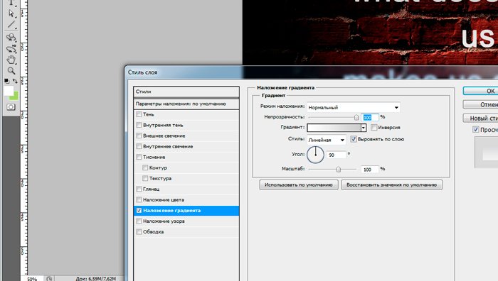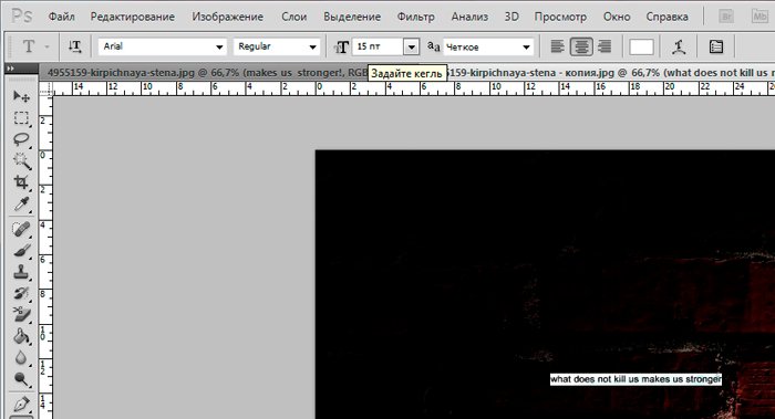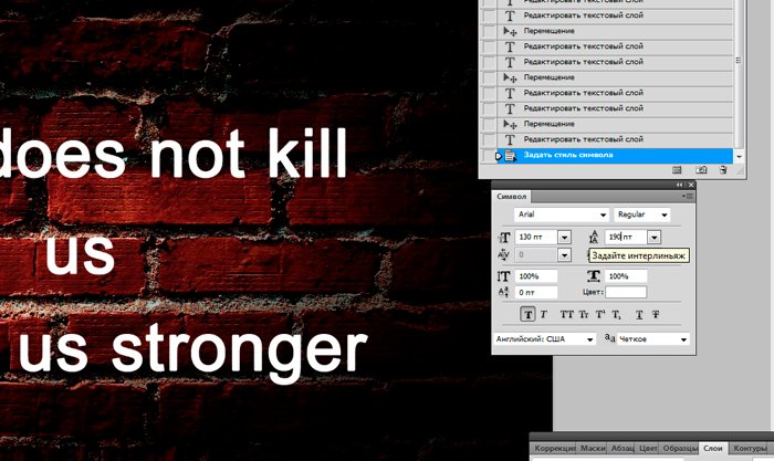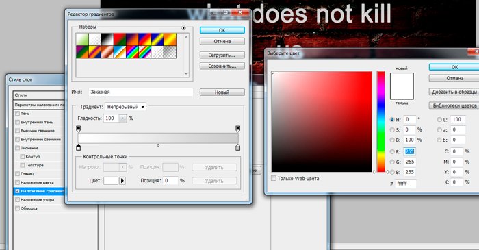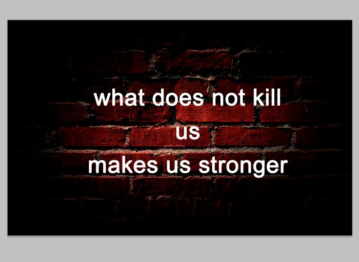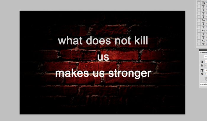 Фотошоп Online | Как сделать надпись в фотошопе.Как сделать простейшую надпись в фотошопе? Нет ничего проще. Работа с текстовыми инструментами одна из самых элементарных вещей, тем не менее, которую вам необходимо усвоить. Умение работать с текстом в программе Photoshop пригодится вам еще не раз. Поэтому, давайте приступим. Чтобы создать интересные обои для рабочего стола с красивой надписью совсем не обязательно быть гуру фотошопа. Я продемонстрирую вам, как сделать стильные обои всего за 5 минут. Для начала найдем хороший фоновый рисунок. Давайте остановимся на кирпичной стене с виньеткой. В качестве надписи возьмем крылатое выражение «Что нас не убивает, делает нас сильнее» на английском языке. Открываем фоновый рисунок и используем инструмент «Текст». ![]() И пишем : «What does not kill us makes us stronger». ![]() Как вы можете заметить, надпись слишком мала. Как увеличить шрифт в фотошопе? Довольно просто. Мышкой выделяем текст и переходим к панели инструментов «Текст», располагающейся вверху. Увеличиваем размер шрифта до 130. Возьмём шрифт Arial. Теперь нам необходимо красиво расположить текст. ![]() Кликаем по левой кнопке мыши возле слова «kill» и нажимаем enter. Ту же операцию проделываем после слова «us». Итак, текст нужно размера, но не мешало бы выровнять его по центру. Возвращаемся к панели редактирования текста и нажимаем «Выключка текста по центру». ![]() И с помощью инструмента «перемещение» располагаем надпись в центре изображения. ![]() ![]() Согласитесь, не мешало бы несколько увеличить расстояние между строками. Для этого мы переместимся в окно «текст». Увеличим интерлиньяж до 190. Что мы имеем в итоге. ![]() Хотелось бы сделать надпись интереснее. Для этого мы воспользуемся инструментом «Градиент». ![]() В окне «Слои» выбираем наш текстовый слой и кликом по правой клавише мыши находим «параметры наложения». Довольно интересная возможность фотошопа, которая при вашей неограниченной фантазии поможет создать много интересных вещей. Но пока нас интересует только градиент, который мы находим в правом меню. ![]() Устанавливаем следующие настройки: ![]() Кликнув по полю «градиент» мы получим возможность выбрать интересующие нас цвета. Я остановлюсь на переходе от белого к серому. Кликаем по левому ползунку, а затем по полю «цвет». Выбираем белый. То же самое проделываем с правым ползунком, но цвет берем чуть серее. ![]() Вуаля! Наша надпись обзавелась градиентом от серого к белому. ![]() Теперь переходим к следующему вопросу «Как сделать текст в фотошопе объемным?». Нет ничего проще. Среди тех же параметров наложения выбираем инструмент «Тиснение» и устанавливаем следующие настройки: ![]() Итак, мы научились делать надпись в фотошопе и узнали, как изменить размер шрифта и сделать текст объемным. Эти чрезвычайно полезные навыки еще не раз пригодятся вам в этой сложной, но чрезвычайно интересной программе. |