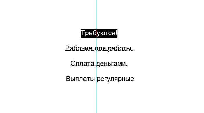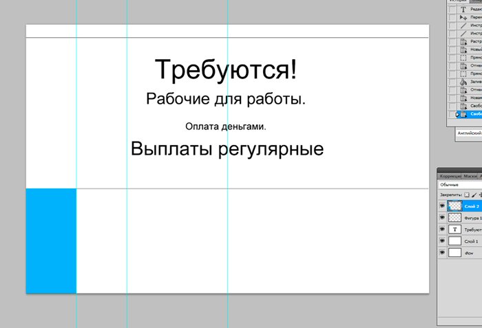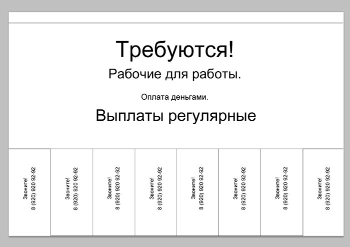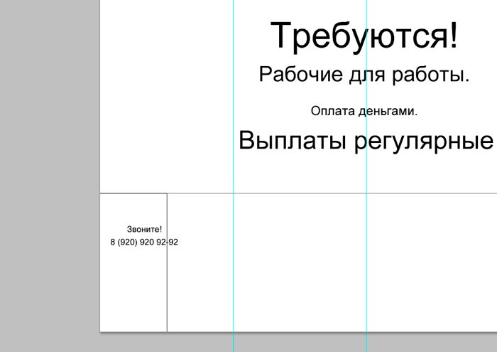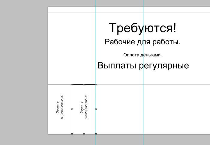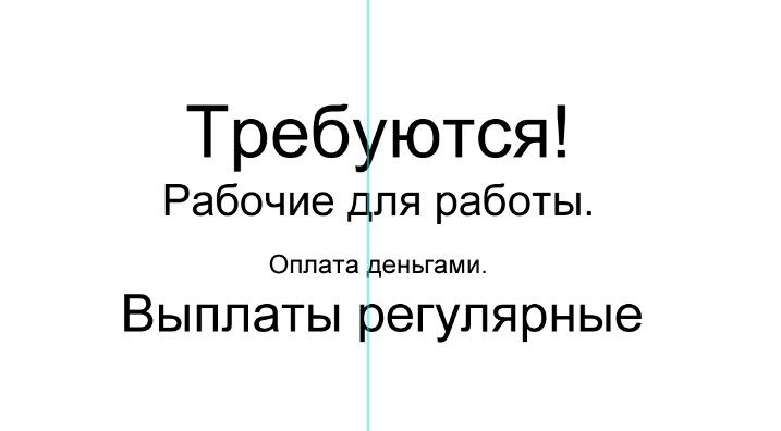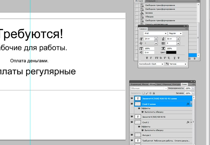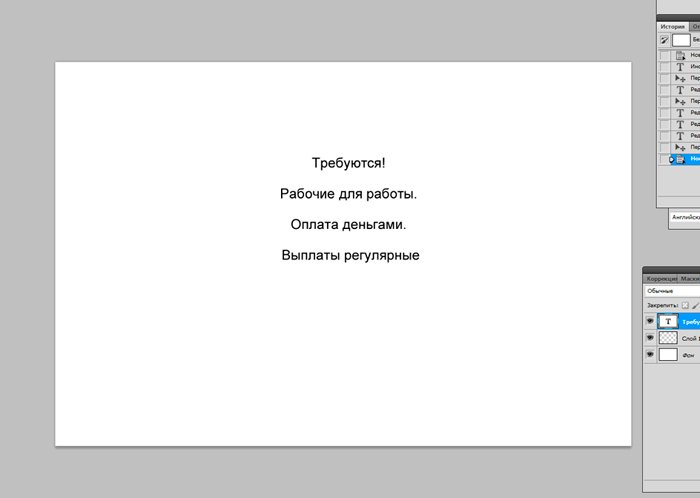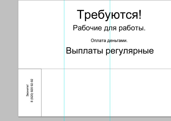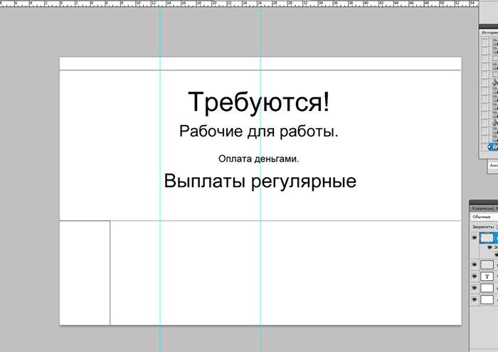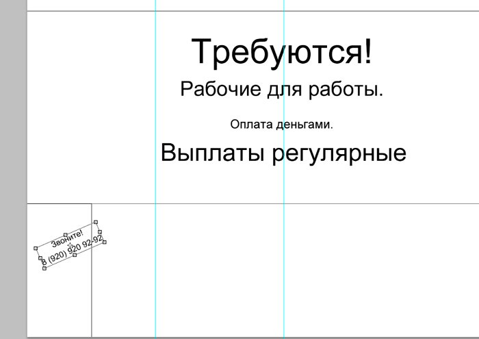 И новый слой, который мы заливаем белым цветом при помощи инструмента «заливка». ![]() Ознакомимся с инструментом текст, располагающимся на панели инструментов. Продумайте текст объявления заранее. Необходимо привлечь внимание людей. Задействуйте в тексте ключевые слова: «продам», «требуется», «работа», «куплю» и так далее. ![]() Ставим курсор на рабочую область и пишем. ![]() Расположим текст в середине документа и разнесем его на разные строки. Для этого задействуйте инструмент «Перемещение». Выбираем инструмент, помещаем курсор на текст и двигаем его. ![]() Разнесем фразы на разные строки. Задействуйте инструмент «Текст». Поместите курсор в начало фразы, которую вы хотите опустить ниже и нажмите enter на клавиатуре. Сделать так, чтобы фразы располагались по центру, вы можете, нажав пиктограмму «Выключка текста по центру». ![]() Вот, что у нас получилось. Мы расположили слова в центральной части на глаз. Как же найти цент документа? Довольно просто. У нас имеется пустой слой. Выбираем инструмент «Перемещение» и кликаем по слою. ![]() ![]() Как видите, в центре документа появились квадратики, помещающие центр документа. Давайте проведем вспомогательные линии, чтобы не потерять координаты центра. Найдите линейку рядом с боковой панелью, поставьте курсор на нее и тяните. Устанавливаем линию на метке середины документа. ![]() Теперь с помощью инструмента «Перемещение» ищем середину текстового блока и располагаем его в центре. Метки центра и вспомогательной линии должны сойтись. ![]() Отредактируем текст. Давайте увеличим размеры слова « требуется». Выбираем инструмент «Текст» и проводим по слову «требуется», выделяя его. ![]() Задаем кегль на верхней панели. Увеличиваем слово до 100 пикселей. ![]() Таким же образом меняем размеры остальных фраз. «Рабочие для работы» - 60 пикселей. «Оплата деньгами» - 36 пикселей. «Выплаты регулярные» - 72 пикселя. ![]() ![]() Теперь сделаем расстояние между строками больше. В этом нам поможет окно «Текст». Задаем интерлиньяж 95 пикселей. ![]() Давайте хотя бы чуть-чуть украсим наше объявление. Для этого мы проведем горизонтальные линии сверху и снизу, задействуйте инструмент «Линия». Все настройки появятся на верхней панели, после того, как вы выберете инструмент. Предлагаю воспользоваться моими. ![]() ![]() Нарисовать линию крайне просто. Проведите курсором по рабочей области. Советую зажать кнопку shift. Так ваши линии будут строго горизонтальными. В окне слоев выбираем слой с нашими фигурами и растрируем. ![]() Теперь создадим отрывные листочки. Допустим, их будет 8. Мне, честно говоря, лень высчитывать по пикселям, какого размера должен быть каждый блок. Поэтому я покажу вам свой способ как разделить поле на 8 частей. Создаем новый слой. А затем выделенную область. ![]() И рисуем прямоугольник ограниченный серединой документа и линией. Заливаем его каким-либо цветом, отличным от белого. ![]() ![]() Нажимаем ctr+d. Выделение снято. Вспоминаем о инструменте «Перемещение» и ищем середину нашего прямоугольника. Не забываем устанавливать вспомогательную линию. Мы разделили половину рабочей области на 2 равных половинки. ![]() Теперь опять берем инструмент «перемещение» и уменьшаем прямоугольник в два раза, просто потянув за боковую линию. Ставим вспомогательную линию. Опять уменьшаем прямоугольник. Проделываем тот же маневр. ![]() Вот мы и получили одну вось