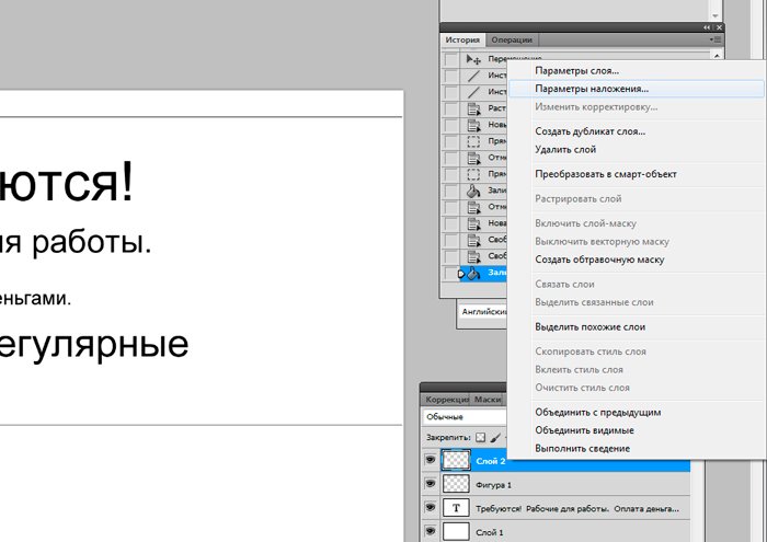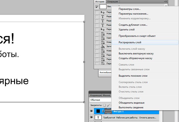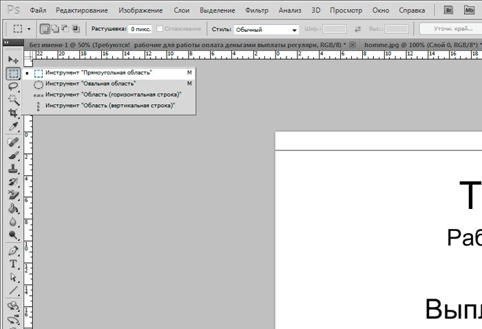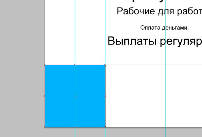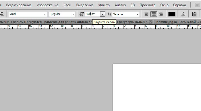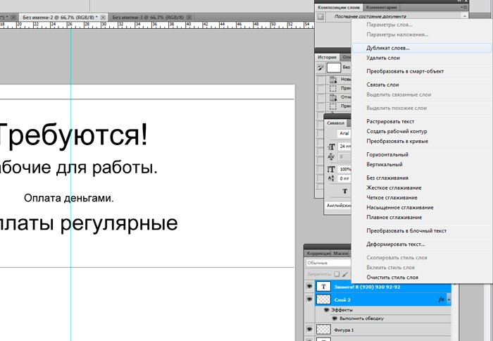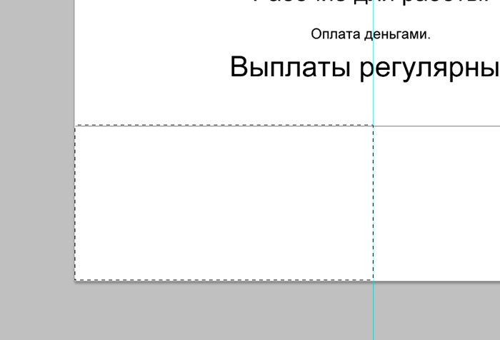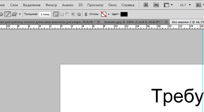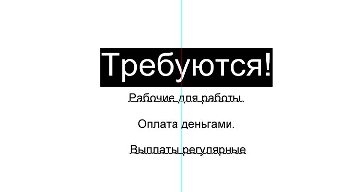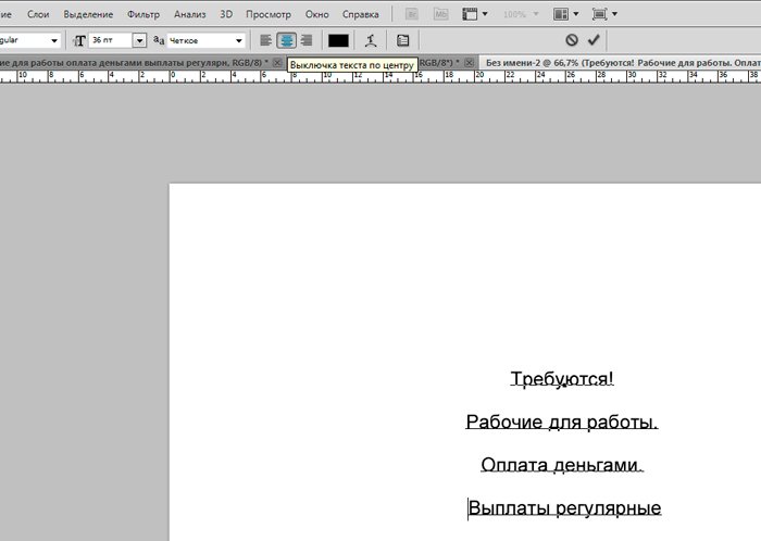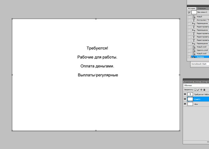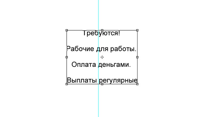 И новый слой, который мы заливаем белым цветом при помощи инструмента «заливка». ![]() Ознакомимся с инструментом текст, располагающимся на панели инструментов. Продумайте текст объявления заранее. Необходимо привлечь внимание людей. Задействуйте в тексте ключевые слова: «продам», «требуется», «работа», «куплю» и так далее. ![]() Ставим курсор на рабочую область и пишем. ![]() Расположим текст в середине документа и разнесем его на разные строки. Для этого задействуйте инструмент «Перемещение». Выбираем инструмент, помещаем курсор на текст и двигаем его. ![]() Разнесем фразы на разные строки. Задействуйте инструмент «Текст». Поместите курсор в начало фразы, которую вы хотите опустить ниже и нажмите enter на клавиатуре. Сделать так, чтобы фразы располагались по центру, вы можете, нажав пиктограмму «Выключка текста по центру». ![]() Вот, что у нас получилось. Мы расположили слова в центральной части на глаз. Как же найти цент документа? Довольно просто. У нас имеется пустой слой. Выбираем инструмент «Перемещение» и кликаем по слою. ![]() ![]() Как видите, в центре документа появились квадратики, помещающие центр документа. Давайте проведем вспомогательные линии, чтобы не потерять координаты центра. Найдите линейку рядом с боковой панелью, поставьте курсор на нее и тяните. Устанавливаем линию на метке середины документа. ![]() Теперь с помощью инструмента «Перемещение» ищем середину текстового блока и располагаем его в центре. Метки центра и вспомогательной линии должны сойтись. ![]() Отредактируем текст. Давайте увеличим размеры слова « требуется». Выбираем инструмент «Текст» и проводим по слову «требуется», выделяя его. ![]() Задаем кегль на верхней панели. Увеличиваем слово до 100 пикселей. ![]() Таким же образом меняем размеры остальных фраз. «Рабочие для работы» - 60 пикселей. «Оплата деньгами» - 36 пикселей. «Выплаты регулярные» - 72 пикселя. ![]() ![]() Теперь сделаем расстояние между строками больше. В этом нам поможет окно «Текст». Задаем интерлиньяж 95 пикселей. ![]() Давайте хотя бы чуть-чуть украсим наше объявление. Для этого мы проведем горизонтальные линии сверху и снизу, задействуйте инструмент «Линия». Все настройки появятся на верхней панели, после того, как вы выберете инструмент. Предлагаю воспользоваться моими. ![]() ![]() Нарисовать линию крайне просто. Проведите курсором по рабочей области. Советую зажать кнопку shift. Так ваши линии будут строго горизонтальными. В окне слоев выбираем слой с нашими фигурами и растрируем. ![]() Теперь создадим отрывные листочки. Допустим, их будет 8. Мне, честно говоря, лень высчитывать по пикселям, какого размера должен быть каждый блок. Поэтому я покажу вам свой способ как разделить поле на 8 частей. Создаем новый слой. А затем выделенную область. ![]() И рисуем прямоугольник ограниченный серединой документа и линией. Заливаем его каким-либо цветом, отличным от белого. ![]() ![]() Нажимаем ctr+d. Выделение снято. Вспоминаем о инструменте «Перемещение» и ищем середину нашего прямоугольника. Не забываем устанавливать вспомогательную линию. Мы разделили половину рабочей области на 2 равных половинки. ![]() Теперь опять берем инструмент «перемещение» и уменьшаем прямоугольник в два раза, просто потянув за боковую линию. Ставим вспомогательную линию. Опять уменьшаем прямоугольник. Проделываем тот же маневр. ![]() Вот мы и получили одну вось