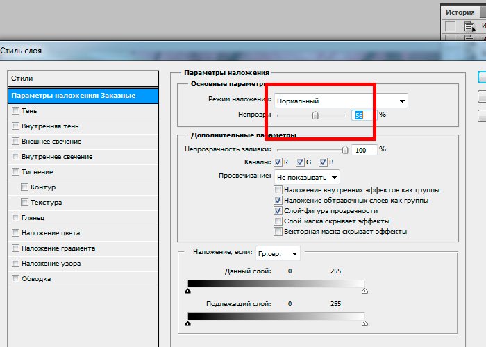 Фотошоп Online | Как сделать слой прозрачным и полупрозрачным в фотошопеЭтот урок я хочу посвятить такому интересному моменту, как прозрачность слоев в фотошопе. Создание слоев – один из основных крайне необходимых навыков работы в Adobe Photoshop. Если вы уже пытались разобраться с этой операцией, вы абсолютно точно сталкивались с определением «непрозрачность слоя». Что это такое и с чем его едят? Какой слой считается прозрачным?Давайте разберем первую ситуацию. Допустим, есть у нас исходное изображение. Допустим, фото. И нам следует создать новый слой. Предположим, с помощью комбинации клавиш ctrl+shift+n. Вот такой новый слой и будет прозрачным. Вторая ситуация. У вас уже имеется документ с двумя слоями. Оба непрозрачны. Выглядит это примерно так. ![]() ![]() То, что слоя у нас на исходном изображении два мы можем заметить в окне слоев. Давайте попробуем сделать слой с Харли Квин прозрачным. Для этого в окне слоев мы выбираем верхний и снижаем его прозрачность до нуля, сдвигая ползунок. Слой с Харли стал прозрачным, на исходнике у нас проступило изображение Дедпула. Вот так все оказалось просто. ![]() Как сделать слой полупрозрачным?Вернемся к тому же исходнику с Дедпулом и Харли. Но на этот раз уже сдвигаем ползунок не до нуля. Оставим, допустим, процентов 50. Что выйдет? ![]() ![]() Прием очень полезный. Часто используется в веб дизайне и при создании коллажей. Каким еще методом мы можем повлиять на прозрачность слоя? Прозрачность слоя можно изменить через параметры наложения. Не слишком удобный обходной путь. Хотя, в свое время я довольно часто на него натыкалась, потому поведаю. Зайдите в параметры наложения. ![]() ![]() В появившемся окне мы видим тот же ползунок со шкалой в процентах. Долго и нудно, конечно. Но по факту существует такая вещь и с помощью нее действительно можно уменьшить прозрачность слоя. |