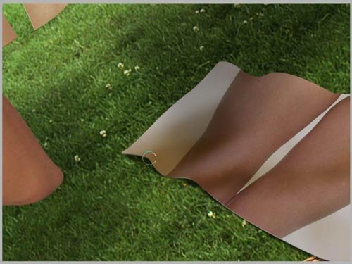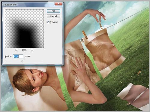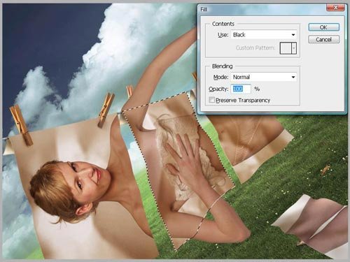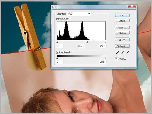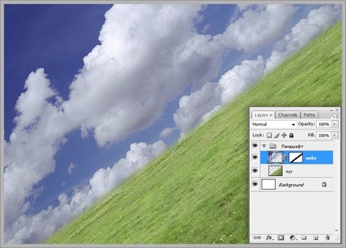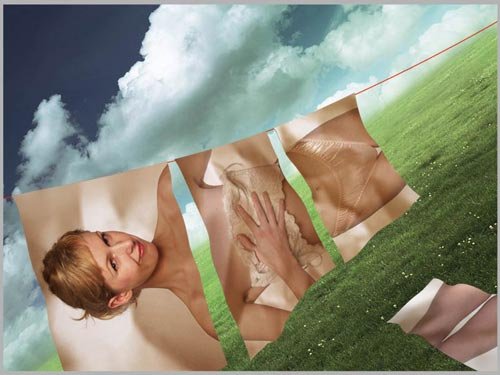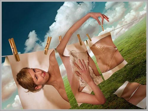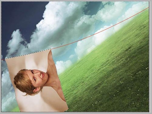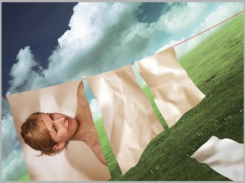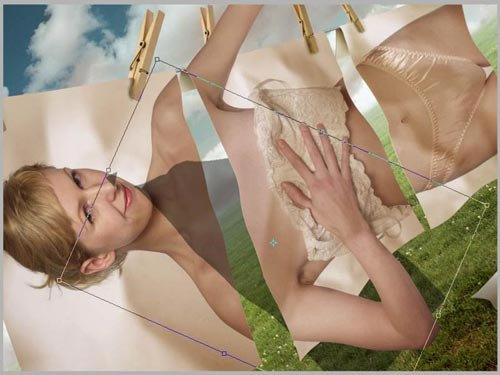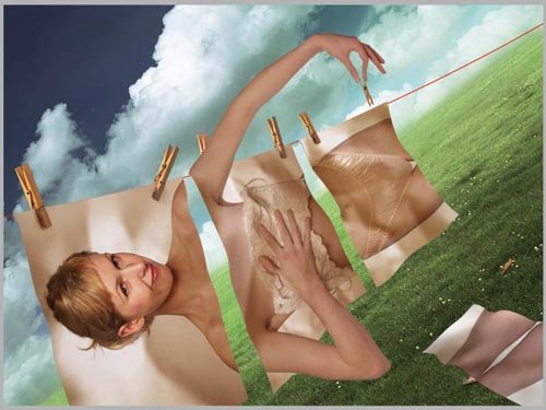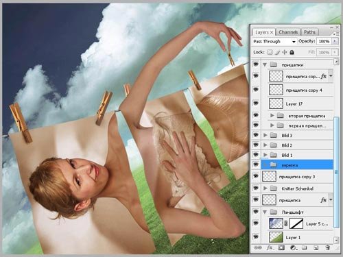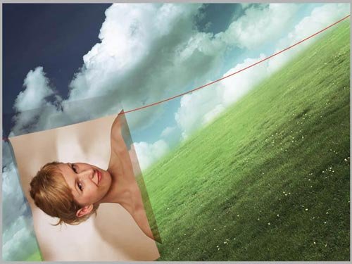 Фотошоп Online | Коллаж из фотографии в фотошоп![]() Материалы, использованные в уроке. Все изображения для монтажа полностью готовы и разрезаны. Для личной практики можно найти подходящие изображения и все сделать самостоятельно. Шаг 1.Давайте создадим новый документ размерами 20 на 15 см и разрешением 300 рх.![]() Начнем работу с подготовки фона: перетяните в этот документ изображение поляны. Шаг 2.Изменим угол зрения, повернув траву против часовой стрелки примерно на 30° — добавим немного динамики изображению. Теперь пропорционально увеличим размер поляны так, чтобы её изображение закрыло собой голые участки по бокам. Затем откройте файл Himmel-Небо и поступите с ним так же (слой с небом должен быть выше травы и перекрывать ее верхний край, своим нижним):![]() Шаг 3.Смягчим немного линию горизонта. Добавьте слою с небом маску и черной кистью, с мягкими краями, проведите по месту соприкосновения неба и травы (тем самым смягчим резкую грань между этими изображениями ). Следите, чтобы ни в коем случае не проявился верхний жесткий край изображения с травой:![]() Шаг 4.Добавим нашему ландшафту ощущение глубины. Перейдите в режим быстрой маски (Q) и, перпендикулярно горизонту, проведите линейным чёрно-белым градиентом по холсту документа. Вернитесь в нормальный режим (Q) и "подсветите" небо на горизонте, вызвав команду Levels (Ctrl+L) и передвинув средний ползунок к значению около 2 — дальняя, если смотреть по перспективе, часть неба осветлится (с поляной сделайте то же самое). Таким образом, мы создали эффект перспективы :![]() Шаг 5.После того, как мы создали эффект перспективы (дальние объекты на отрытом пространстве выглядят всегда светлее), объедините оба слоя в группу. Рекомендую это делать всегда, чтобы не запутаться в навигации слоёв, так как в объёмных проектах их может накопиться несметное количество:![]() Шаг 6. Добавим дымку горизонтуПродублируем созданную группу слоев с небом и поляной и слейте ее в один слой. Сотрите на этом слое все кроме линии горизонта, чтобы она осталась не менее 300рх в ширину, размойте ее фильтром Gaussian Blur с диаметром в 25 рх. Чтобы усилить перспективу, немного осветлите эту дымку, чтобы она вписывалась в общий ландшафт (также можно понизить opacity и обработать края при помощи маски):![]() Шаг 7.Откройте файл Hilfsleinec изображением верёвки (файл в формате PSD), перетяните ее в рабочий документ и расположите ее поверх остальных слоев. Веревка послужит для ориентировки при размещении изображения модели из трёх частей, которая будет подвешена на прищепки. Дальше откройте файл Knitter/складка 1 и разместите это изображение в левом конце веревки как на изображении внизу :![]() Шаг 8.Откройте теперь изображение с лицом и расположите его на первом повешенном полотнище. При помощи трансформации (изменения размера, поворота, легкой деформации) подгоните лицо к форме полотнища, а потом измените режим смешивания слоёв на Перекрытие (Multiply), чтобы проявились складки. Главное, чтобы лицо полностью уместилось в границах куска полотна, лишнее же уберется:![]() Шаг 9.Перейдите на слой с материей и выделите Волшебной палочкой маску, что проще всего в данном случае: зажимаем Alt и кликаем между слоями):![]() Шаг 10.После готовности первого полотнища, откройте файлы Knitter 2, Knitter 3 и "повесьте" их рядом на веревке. Оставляйте небольшие расстояние между обоими кусками, чтобы осталось мес
