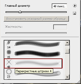 ![]() Шаг 23.В настройках инструмента кисть, выберите, из ранее загруженного набора Кисть – Перекрестные штрихи4 (Crosshatch).