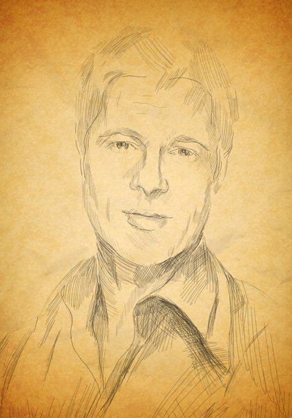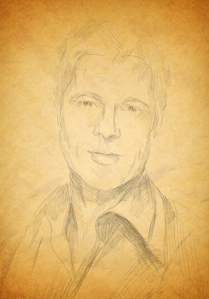 Фотошоп Online | Портрет карандашом в ФотошопПортрет карандашом в Фотошоп В этом уроке на конкретном примере будет показано, как за короткий срок создать портрет понравившегося вам человека средствами программы Adobe Photoshop так, что бы он выглядел как карандашный рисунок на бумаге. В уроке Как в Photoshop сделать из фото рисунок карандашом представлен еще один метод создания таких работ. Шаг 1 .Для начала мы выбираем чей портрет будем рисовать. Фотография человека должна отвечать определенным требованиям. Чтобы портрет получился более подробным и реалистичным, разрешение фотографии (количество пикселей-точек на дюйм) должно быть достаточно высоким, так как нам необходимо будет прорисовывать мелкие детали. Мы выбрали фотографию всеми известного Брэда Пита:![]() Разрешение данной фотографии 72 пикселя на дюйм, при размере 45 на 69 см. Чтобы посмотреть параметры фотографии необходимо открыть её в Photoshop, в пункте меню выбрать Изображение - Размер изображения. В открывшемся окне будут указаны параметры. Шаг 2 .Так как в результате мы хотим видеть карандашный рисунок, нам важен не цвет, а тон (темные и светлые места). Мы переводим фотографию в чернобелую через Image - Mode - Grayscale.![]() Следующим шагом будет добавление контраста фотографии. В пункте меню Изображение - Коррекция - Яркость/Контрастность. Подредактируем тональность фотографии произвольно, так что бы черный был более насыщенным, а светлые места более белыми. Нажимаем ОК, в итоге получаем: ![]() Шаг 3 .Создаем новый слой Ctrl+Shift+N, поверх существующего. Первый слой делаем прозрачным, в окне Слои ставим прозрачность 70%. Выбираем инструмент кисть, стандартную с нечетким краем, цвет задаем черный с прозрачностью 30-40 %, размер 3-4 пикселя, что бы линия была достаточно тонкая как от карандаша. И начинаем обводить контур актера в новом пустом слое.Чтобы просматривать результат нашей работы, между слоем с исходной фотографией и нашим рисунком создаем новый слой (Ctrl+Shift+N) и заливаем его белым цветом. В процессе работы он будет отключен, но если время от времени включать его и отключать слой с фотографии мы будем видеть, что нами уже сделано, а что следует еще доработать. ![]() Мы создаем очередной слой (Ctrl+Shift+N) и в нем продолжаем обводить фотографию. Принцип работы как в обычном рисунке — от общего к частному. Не надо сразу бросаться на мелкие детали — реснички и прочее. Необходимо наметить основные формы, где заканчиваются волосы, контуры носа, месторасположение глаз и губ, подбородка и шеи. ![]() Каждый большой блок штриховки желательно делать на новом слое, что бы в будущем было легче редактировать, и удалять ненужные штрихи. ![]() На Рис. 6 мы заштриховали весь пиджак и самую темную часть шеи, показав и более мелкие детали — тень и загиб воротника, складки. Так как это набросок — проследив, наметили плоскости шеи. ![]() А также удаляем вспомогательные слои: первый — с фотографией (она нам больше не понадобится), третий и четвертый слой с контурами лица, они служили нам лишь опорой. Чтобы удалить слой щелкните по нему мышкой — правая кнопка — Удалить слой. ![]() ![]() В итоге у нас должно получиться два слоя один-белый фон, второй наш рисунок на прозрачном фоне. Шаг 4 .Чтобы сделать рисунок более реалистичным мы сделаем ему бумажный фон, для этого нам необходима фактура бумаги. В данном случае использовалось две дополнительных карти